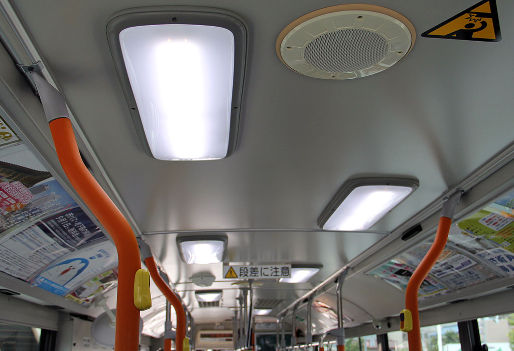 従来は蛍光灯(黒色もしくは車体色カバー付き)でしたが,平成26年夏より平成16年式以降のCNG車以外の車両については白色LED(ゴールドキング製:白色カバー付き)に更新されました.