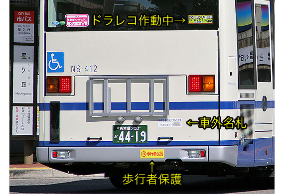 車体後部には,標準ノンステ,環境基準,車いす等のバス車両に一般的に掲出されるステッカーのほか,安全運転の取り組みとして平成24年冬に始まった車外名札※,名古屋市の公用車に掲出される「ドラレコ作動中」「歩行者保護」ステッカーが貼ってあります.