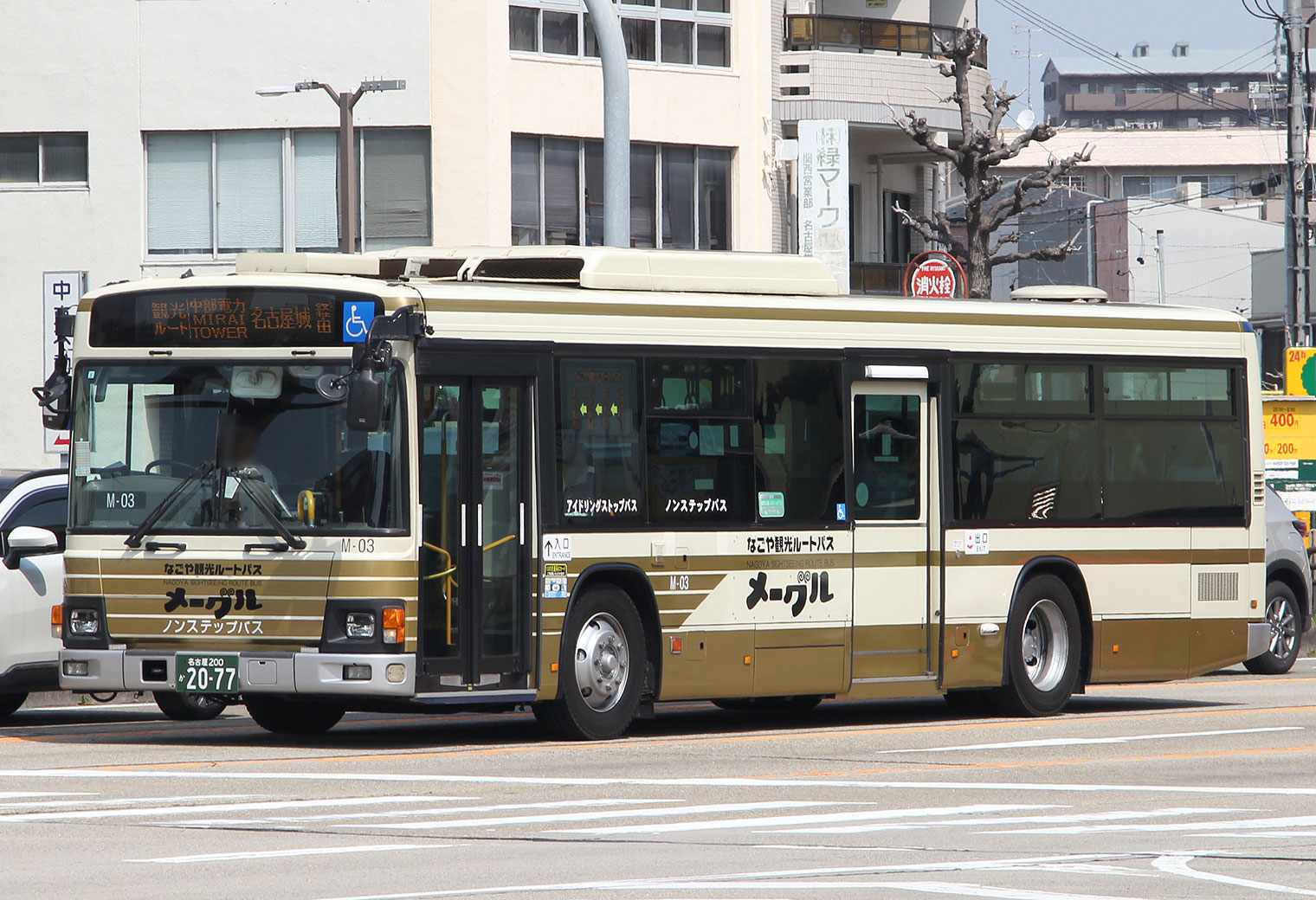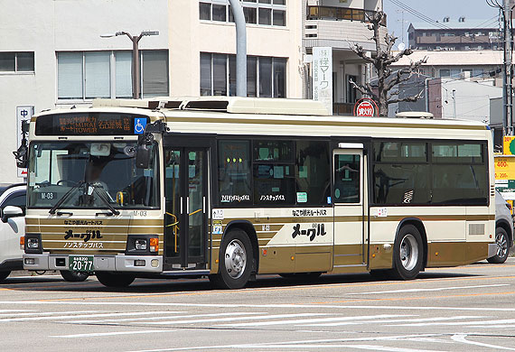 「NH-203号車」は市バス一般車塗装の青帯から,メーグルカラーの金帯に外装変更されるとともに,局番を「(新)M-03号車」と改められました.