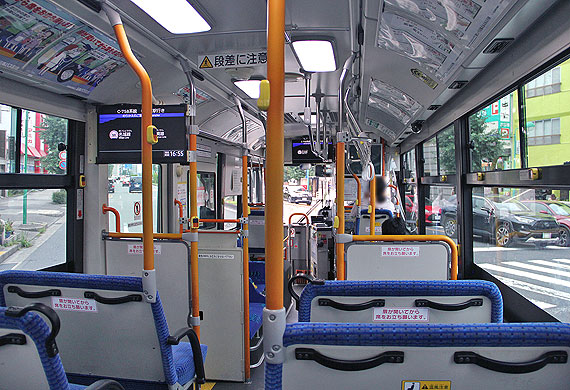 車内は橙色ポールが立ち並ぶ標準ノンステップバス仕様となっています.