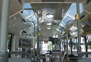 車内も名古屋名所をアイコンとしてあしらった黄色の特注モケットで装飾しています. また液晶モニターを2台備え,停留所案内のほか観光案内動画を放映しています.