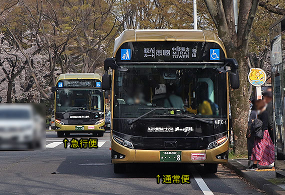 上記専用車&予備車が車検等で運用離脱した場合や,増強運行時は,浄心営業所の一般車が運用されることもあります.