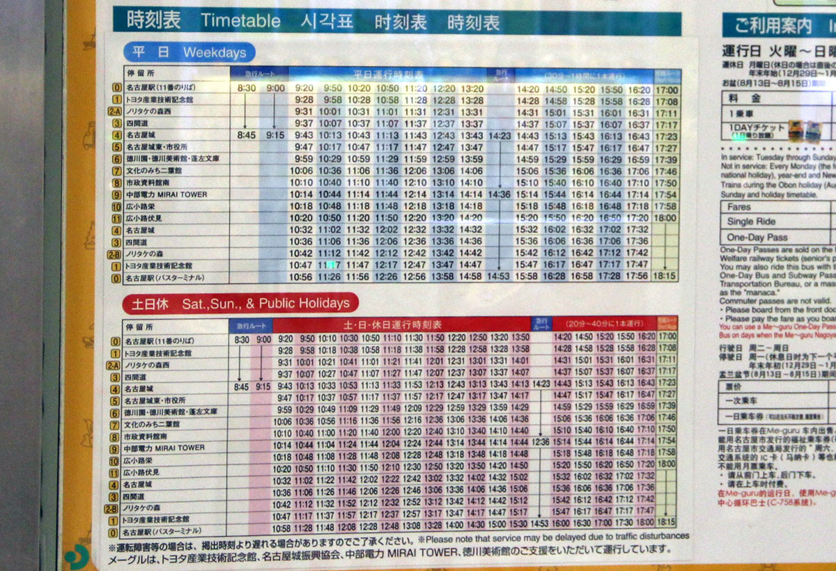 運行時間は,(急行ルートを除き)名古屋駅発時刻9時20分〜17時です. 名古屋駅17時発の最終便のみ,短縮ルートで運行されます. これ以外に1日3便,急行区間便が運行されます.