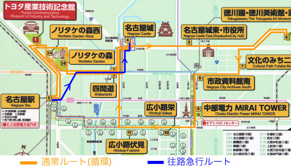 名古屋駅0番のりばを発車し,名古屋城→市役所→文化のみち二葉館→徳川園→文化のみち二葉館→市役所→名古屋城→明道町→ノリタケの森→産業技術記念館を経由して名古屋駅に戻る1方向循環路線でした.