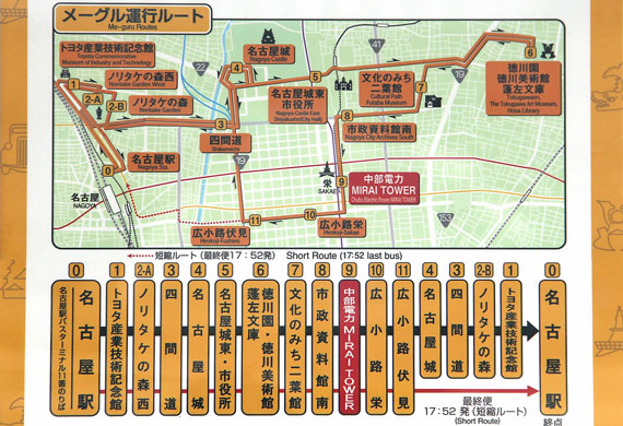 名古屋駅0番のりばを発車し,産業技術記念館→ノリタケの森→名古屋城→市役所→文化のみち二葉館→徳川園→文化のみち二葉館→市役所→名古屋城→ノリタケの森→産業技術記念館を経由して名古屋駅に戻る1方向循環路線でした.