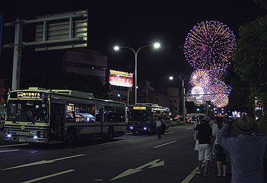▲築地口停留所より花火を背景に |