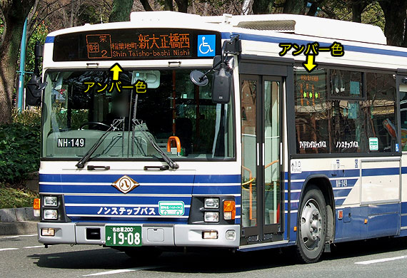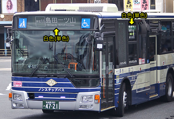 長年,琥珀色(アンバー色)でしたが,令和5年度(2023年度)導入車から白色となっています. 他事業者で見受けられるフルカラー表示器は採用されていません.