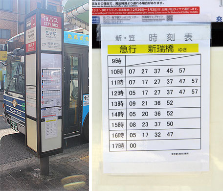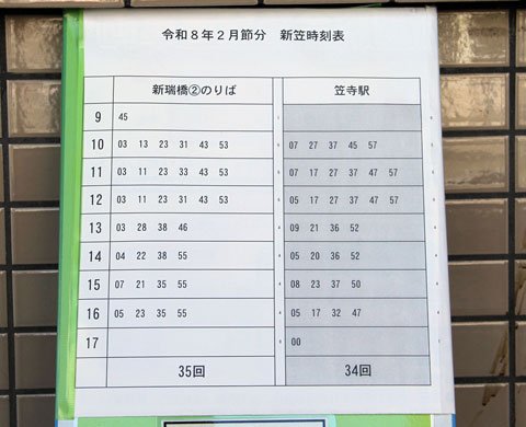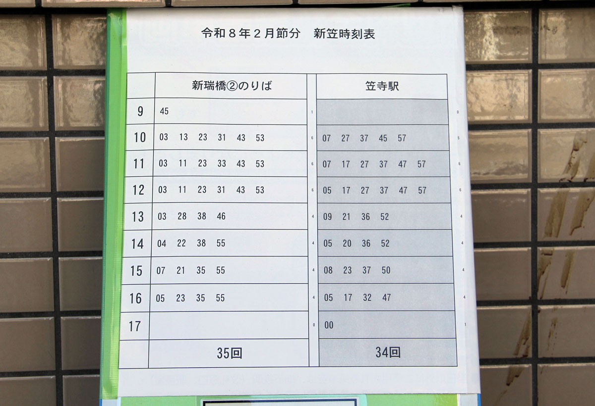 新・笠系統の運行時間は9時台から17時まで,運行本数は新瑞橋発35本,笠寺駅発34本でした.