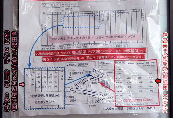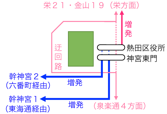 ▲栄21号系統 神宮東門→栄方面の臨時増発便 |