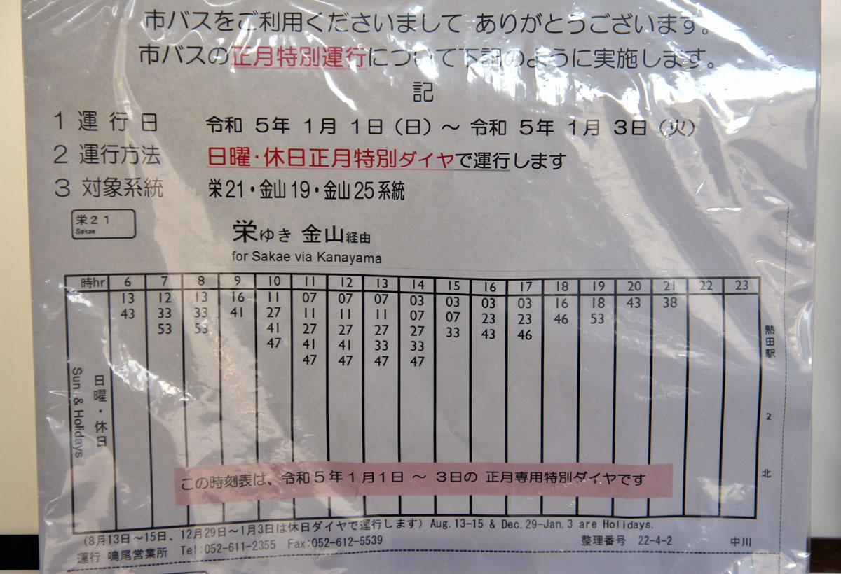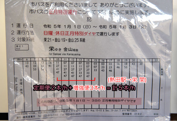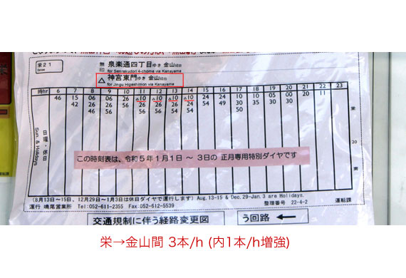 令和5年(2023年)正月までは,栄発神宮東門行き(南行)も増強運行されていました.