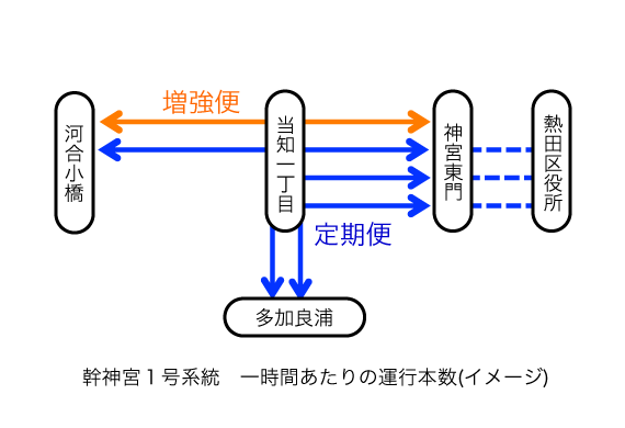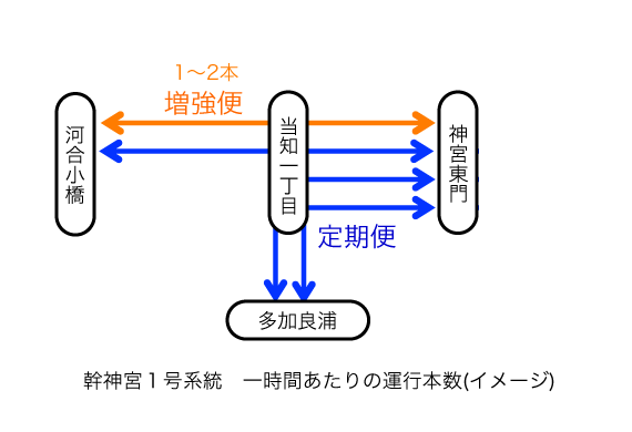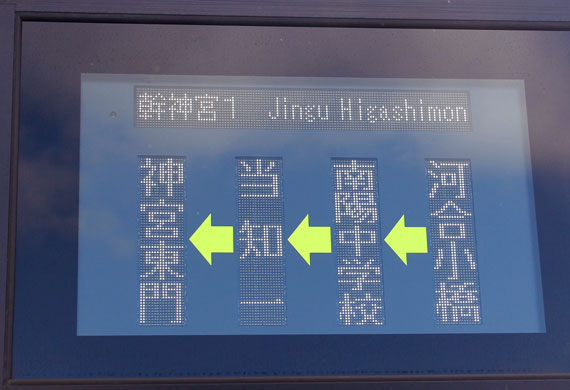 神宮東門行き(東行)は,8時台から11時台までに増強時間帯が短縮されました. 増強運転は計4本です.