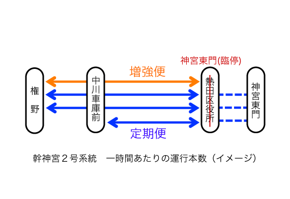 幹神宮2号系統の増強便は,一方向運行となるなど,年々減便されています.
