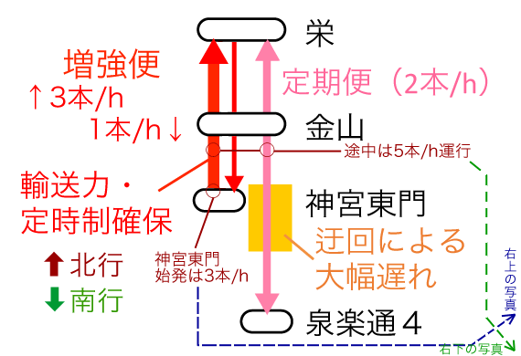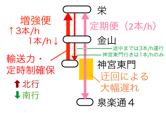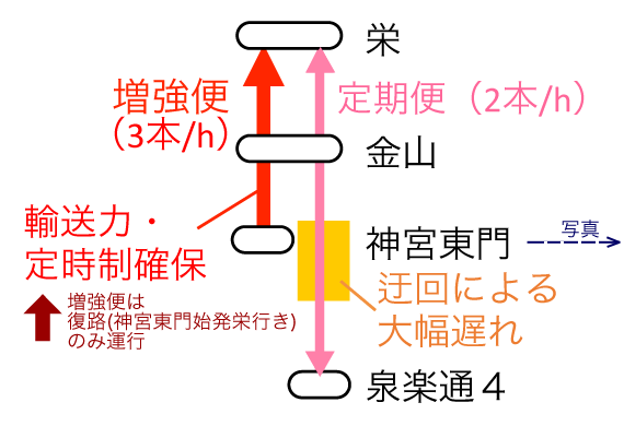 ▲北行(神宮東門→栄方面) 神宮東門臨停(R3年) 増強便=神宮東門始発3本/h |