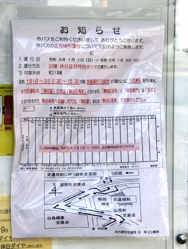 初売りで賑わう栄地区と熱田神宮を結ぶ栄21号系統では,正月限定の「栄〜神宮東門」間の区間便も運転されます.