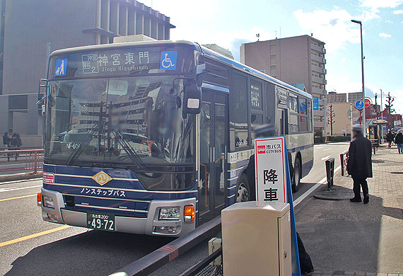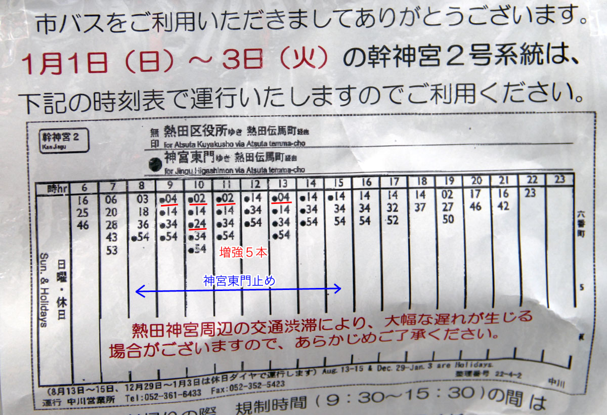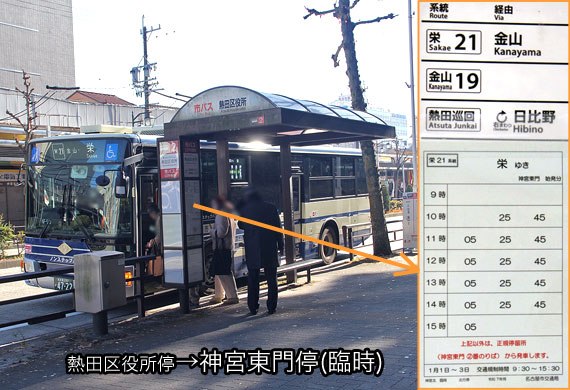 以下,過去の正月三が日臨時輸送の様子を,栄21号系統神宮東門発着増強便を中心に紹介します.