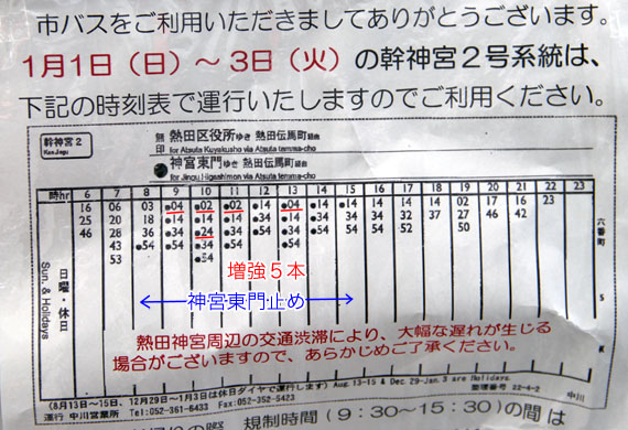 正月ダイヤでは,(交通規制により)神宮東門発着に路線短縮されるとともに,主に神宮東門〜河合小橋間にて増便されます.
