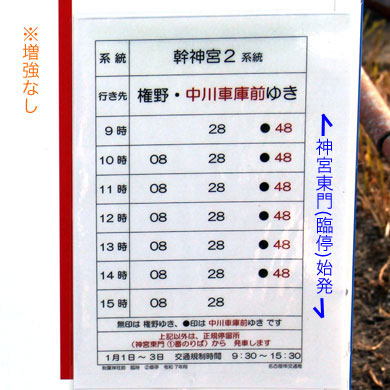 ▲西行(神宮東門→権野方面) 増強なし 令和7年正月の神宮東門停の時刻表 |