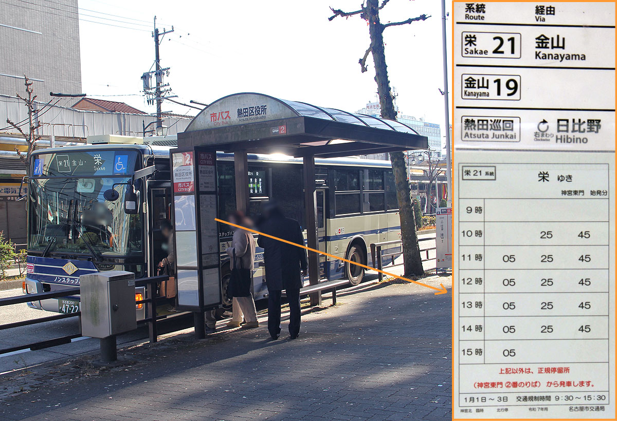 令和4年(2022年)4月ダイヤ改正にて,起点が神宮東門停から熱田区役所停に変更されました. 令和5年(2023年)正月からは次の対応です.