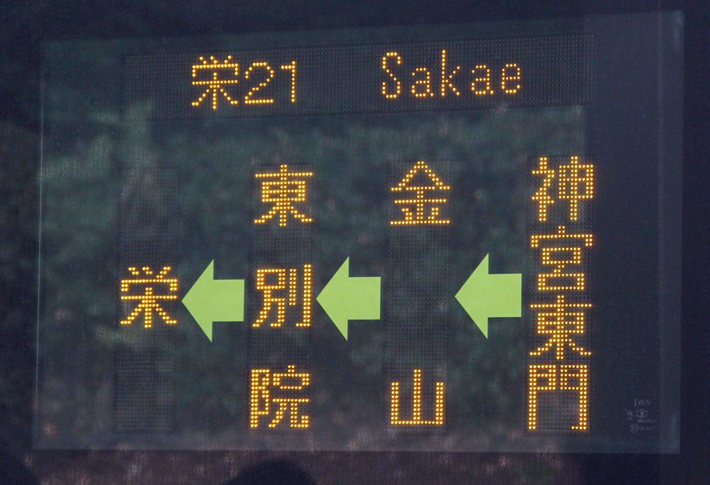 平成28年4月1日ダイヤ改正時の方向幕LEDデータ更新により,栄21号系統の前後LED表示に途中経由地である「金山」が大きく表示されるようになりました.
