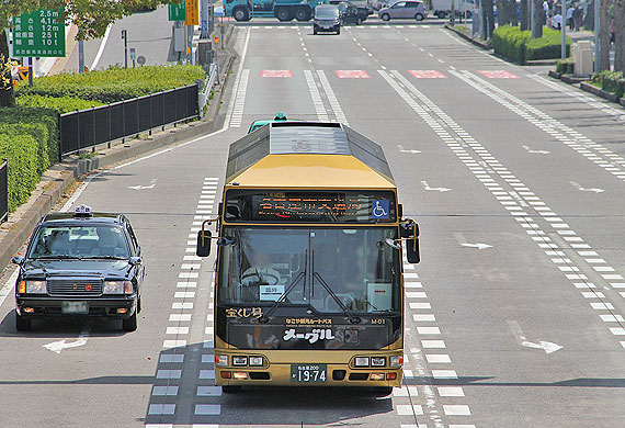 名古屋観光の起点となる名古屋駅と,名古屋随一の観光地である名古屋城を乗換なしで結ぶ路線バスは,一定の需要はあるものの,「なごや城ループバス」が短期間で運行終了したように,交通事業者が独立採算で運行するには厳しい状況でした. このため,名古屋市の観光行政を所管する市民経済局(現在の観光文化交流局)が運行主体となり,平成18年(2006年)からは,市内の歴史・文化・産業観光スポットを巡る通年運行の定期路線として「なごや観光ルートバス」の運行が始まりました. 運行開始にあたり調達された「メーグル」専用車は,堅実な需要予測の基,中型車となりました. しかしながら,土日祝日を中心に予測を上回る利用状況となっています.