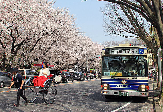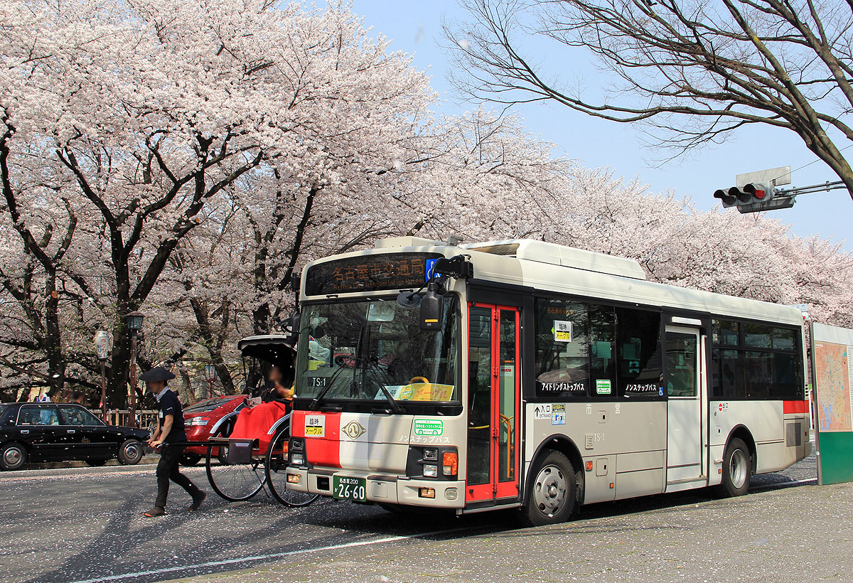 名古屋城は日本三名城に数えられ,大天守及び大天守に上げられた金鯱は名古屋の象徴となっています. 名古屋城は正門と東門があり,東門は地下鉄名城線市役所駅7番出口より徒歩5分の位置にあります. そこで行楽シーズン限定路線として,平成11年(1999年)までは,花見シーズンの「花見バス名古屋城コース」、夏まつり期間の臨時急行バスが,名古屋駅〜名古屋城間を運行していました. 平成12年(2000年)からは,通年運行の定期路線として「名古屋城ループバス」の運行が始まりましたが,利用状況は芳しくなく,平成15年12月に廃止となりました. 平成17年(2005年)の愛知万博開催期間中は,万博を機に名古屋を訪れた方々に歴史文化観光を楽しんでもらうため,2種類の臨時路線バスが運行され,それぞれ名古屋城を経由地としました. 平成18年(2006年)からは,市内の歴史・文化・産業観光スポットを巡る通年運行の定期路線として「名古屋観光ルートバス」が通年運行されています.