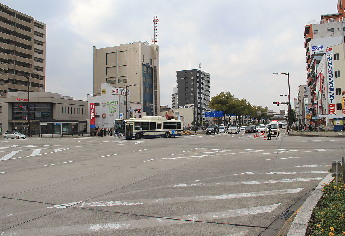 ▲(カメラ1)旗屋町交差点 普段は経由しない交差点を直進する栄21号系統 |