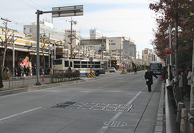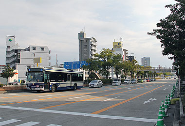 ▲秋葉交差点の様子 一般車進入禁止の市バス専用待機場所となる |