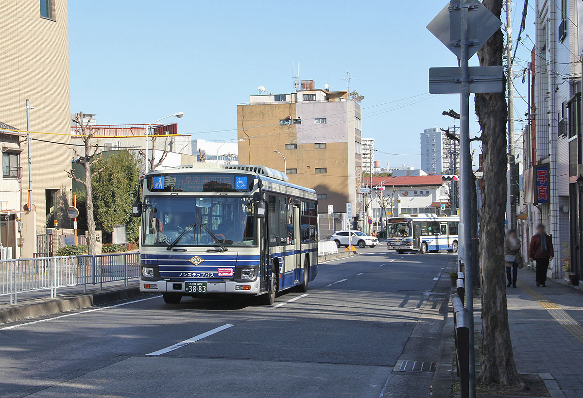 「神宮東門」停を発車し旗屋町交差点方面へ向かう幹神宮2号&熱田巡回系統は,「熱田区役所」停(北行)改め「神宮東門」臨時停で乗車扱いし,旗屋町交差点方面へ向かいます.「熱田駅西」停(西行)は休止扱いのため通過します.