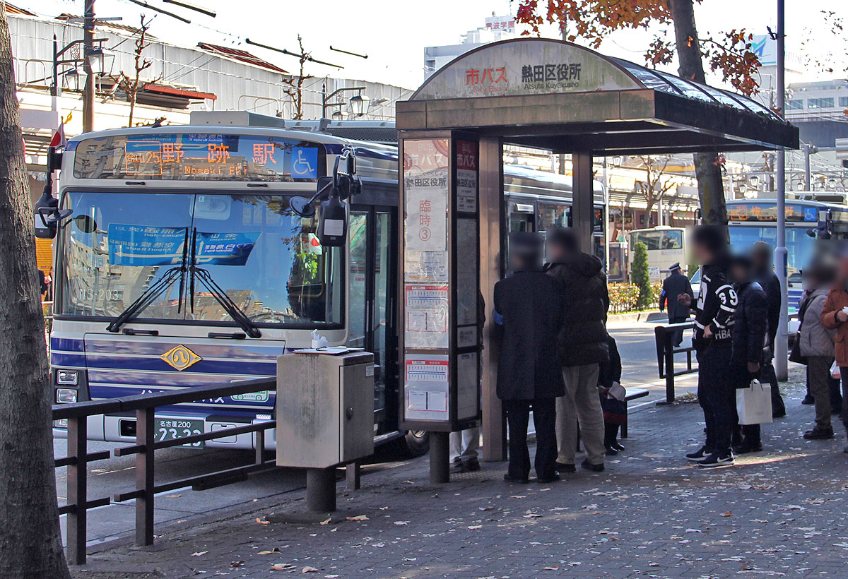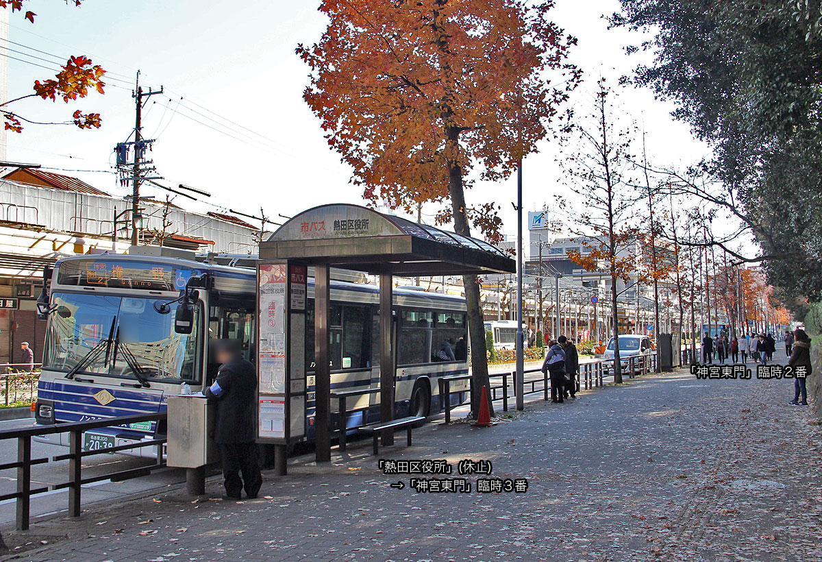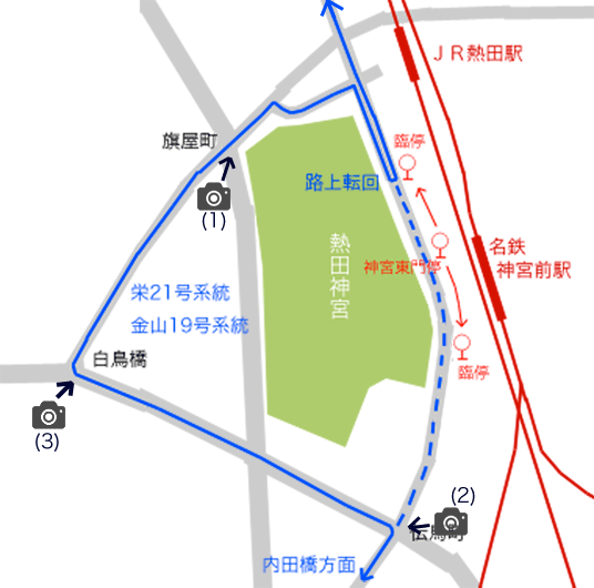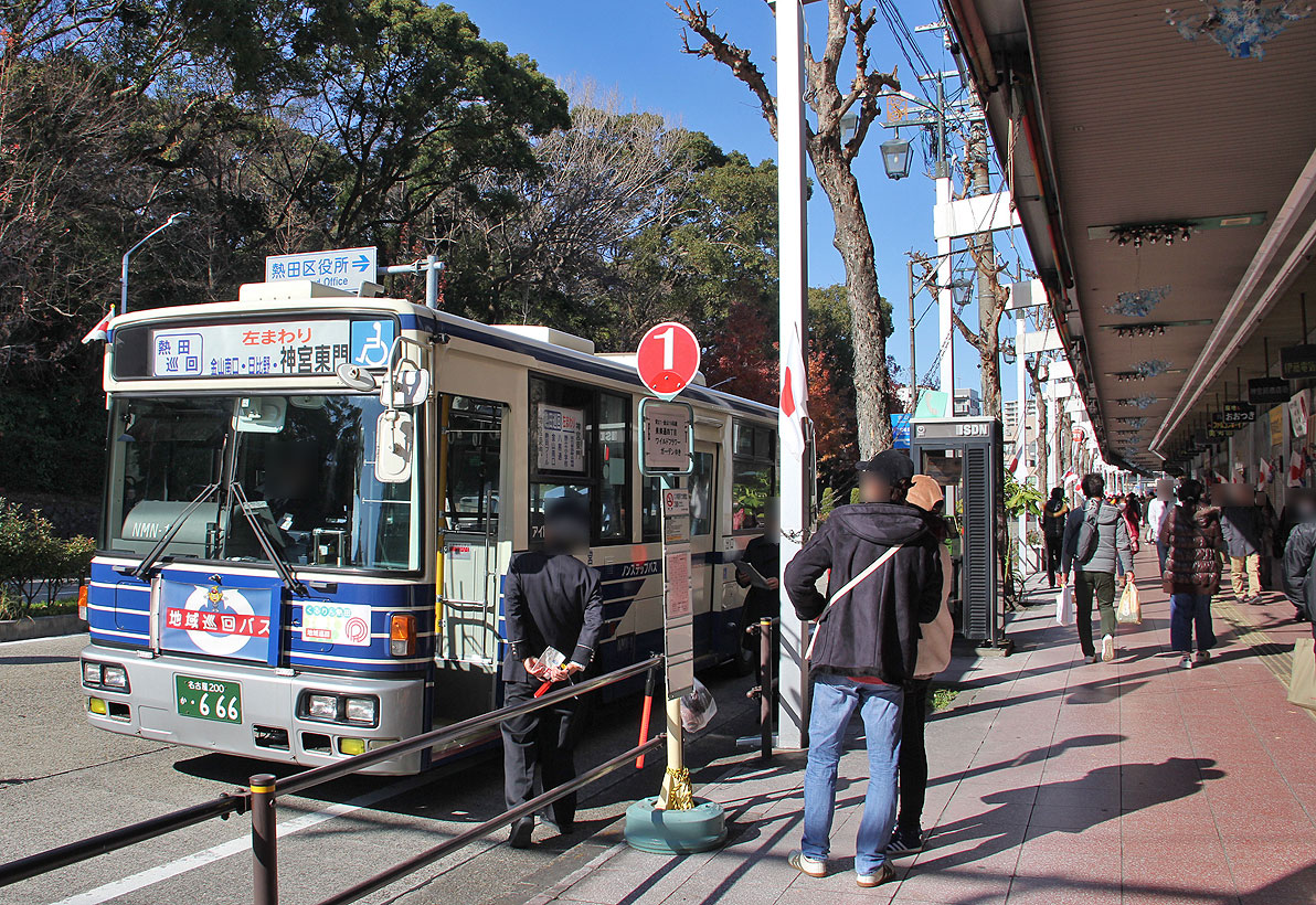「神宮東門」停を終点とする系統は,「熱田区役所」停(南行)に停車後,約100m先の「神宮東門」臨時降車停で降車扱いします.その後,バスは路上回転スペース前後で発車時刻まで待機します.