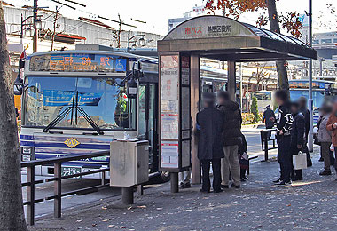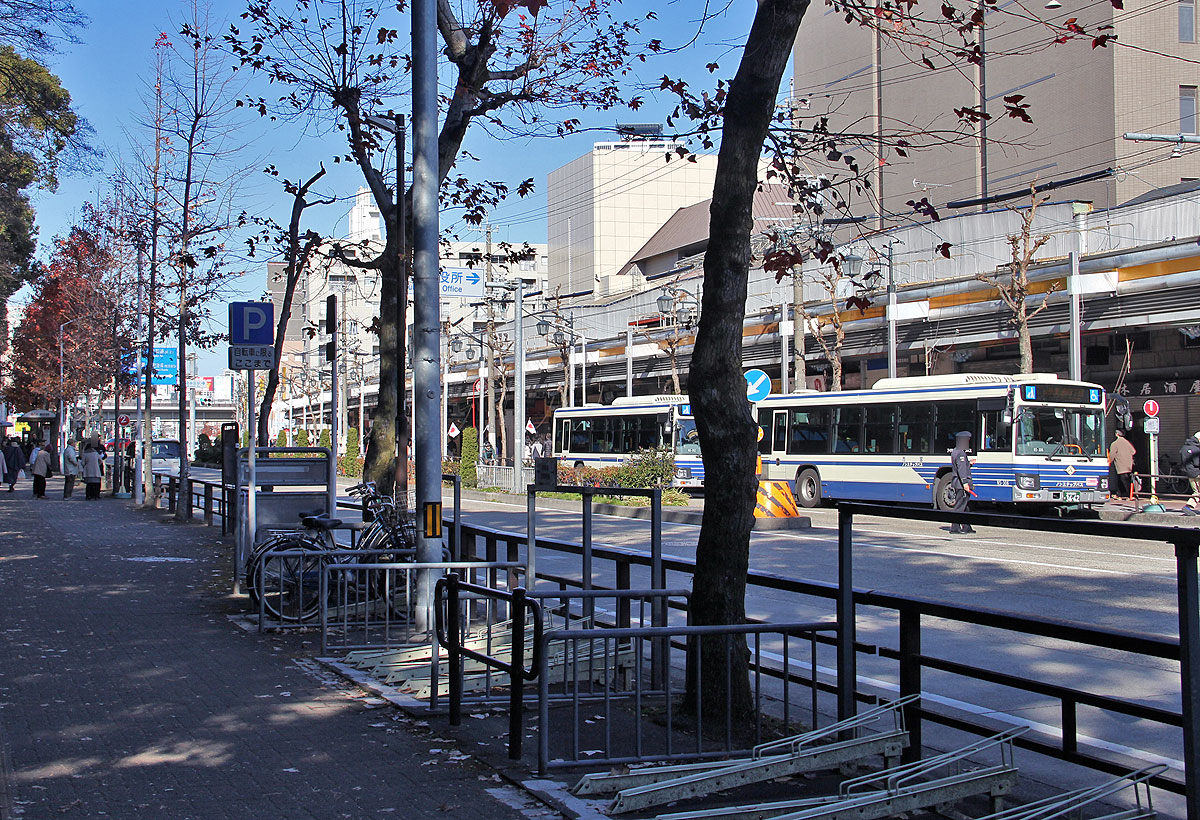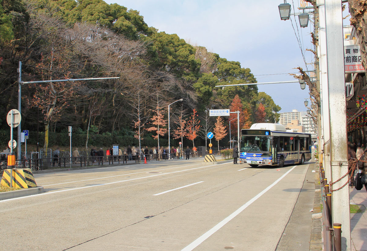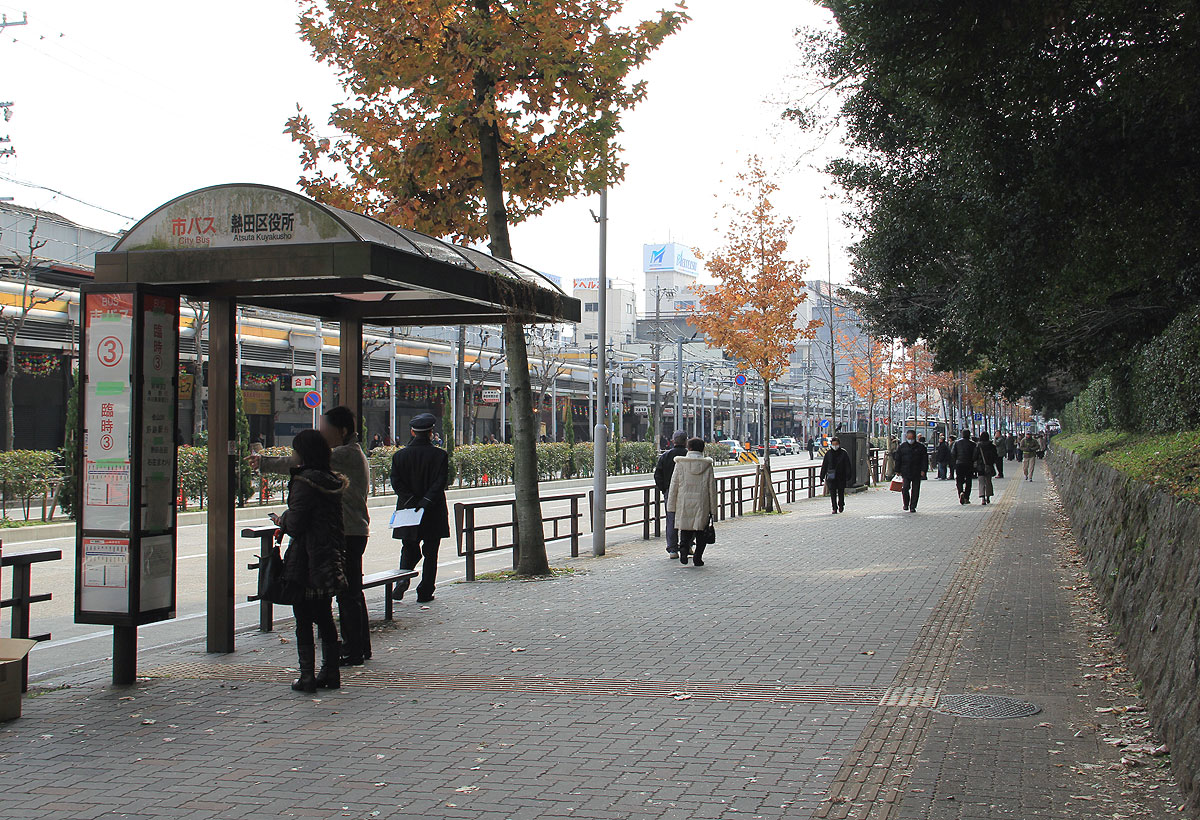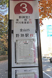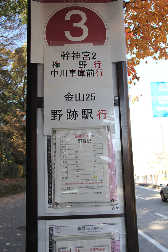 「神宮東門」停を終点とする系統は,「熱田区役所」停(南行)に停車後,約100m先の「神宮東門」臨時降車停で降車扱いします.その後,バスは路上回転スペース前後で発車時刻まで待機します.