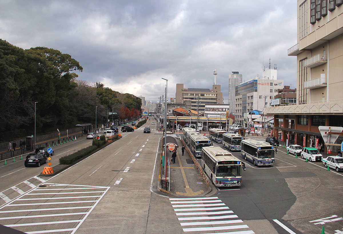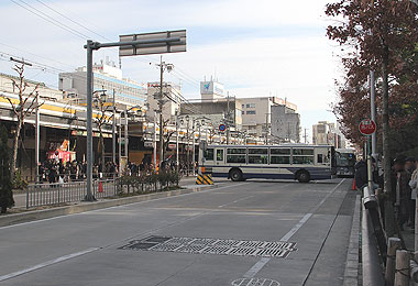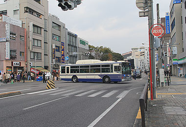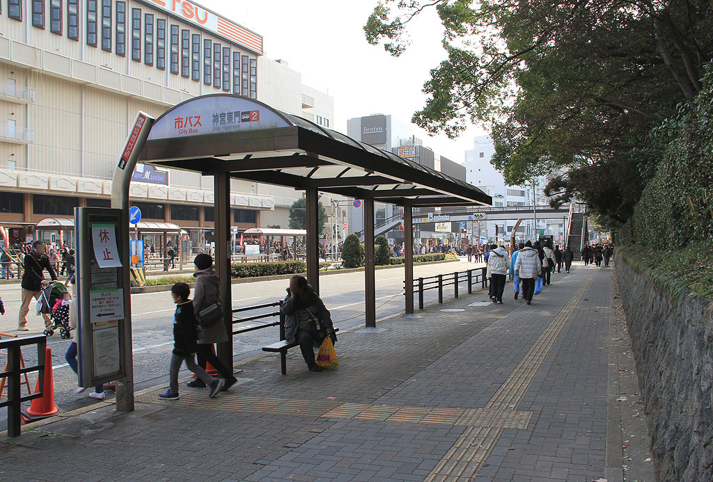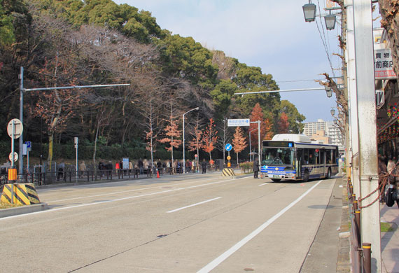 この中に,市バス主要拠点の一つである神宮東門停留所があり,通過系統が迂回運行するほか,神宮東門を起点とする路線では路上転回を行います.