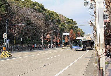 神宮東門を通過する栄21号,金山19号(金山発着便のみ)系統は,神宮東門(北)臨時停にて路上転回したのち,熱田神宮周辺渋滞を避けて白鳥橋まで大きく迂回運行します.
