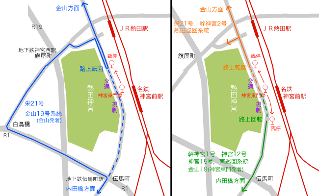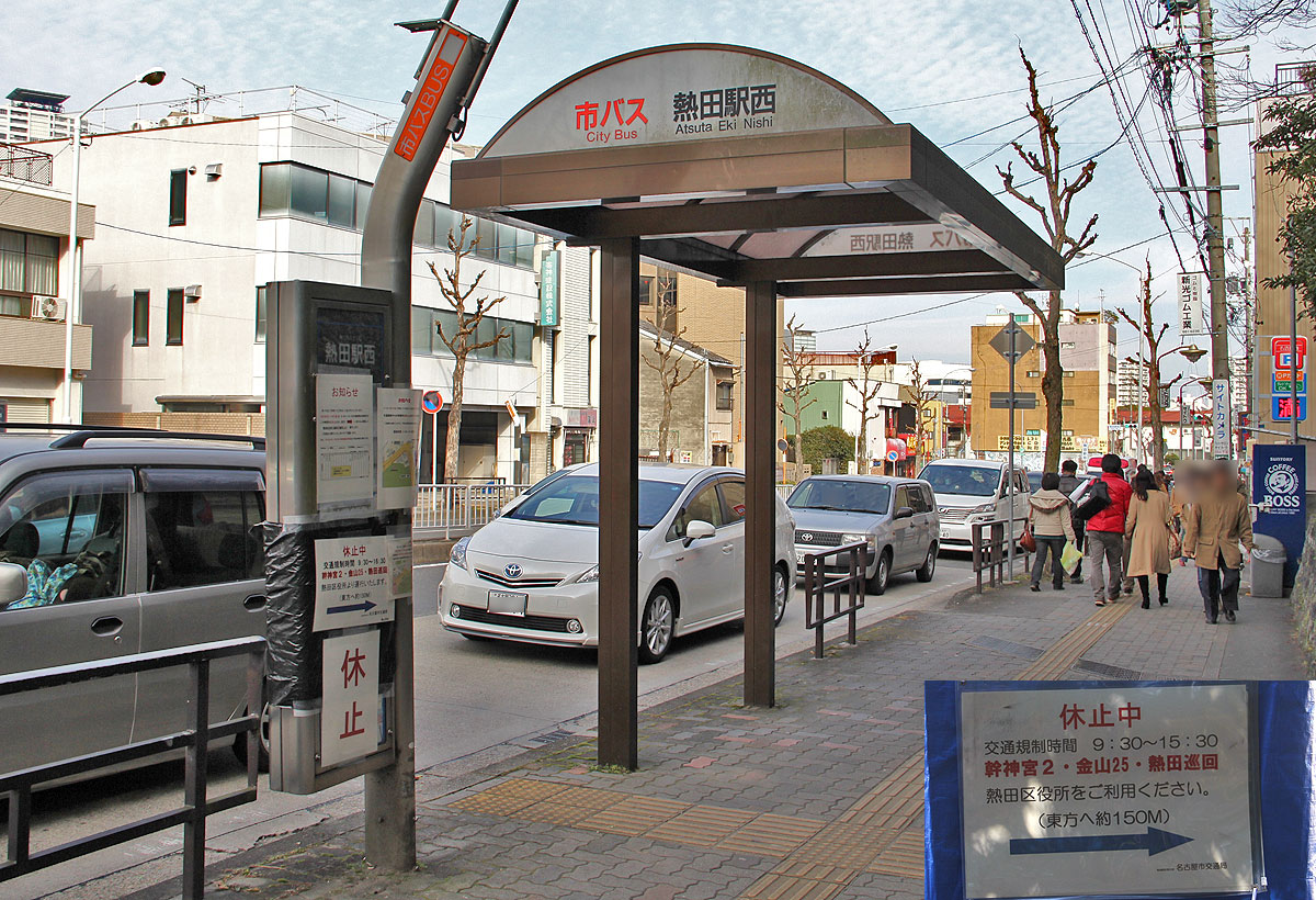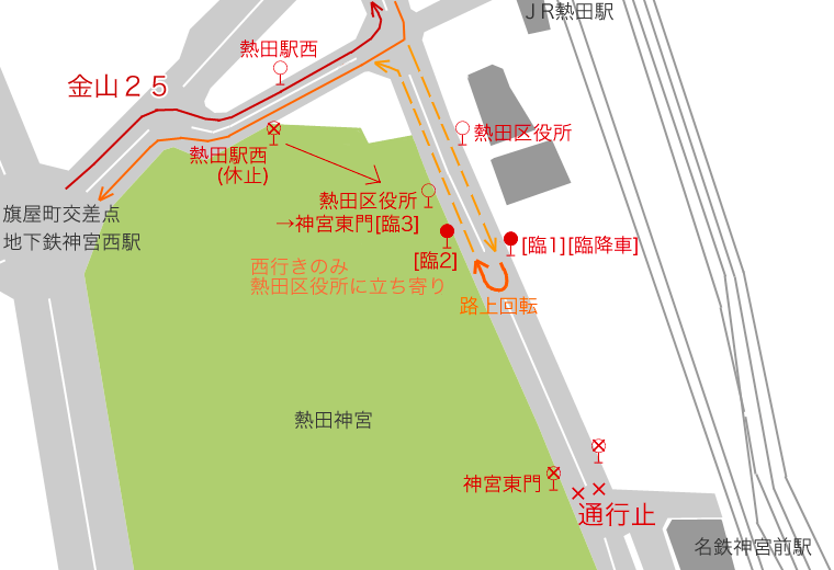 特殊な事例として,本来は「神宮東門」停を経由しない金山25号系統野跡駅行は,「熱田駅西」停(西行)が休止されるため,熱田駅前交差点を直進して神宮東門方面へ向かい,乗客を乗せたまま路上回転し,「熱田区役所」停(北行)改め「神宮東門」臨時停と名乗る停留所を「熱田駅西」停の代替として使用します.
