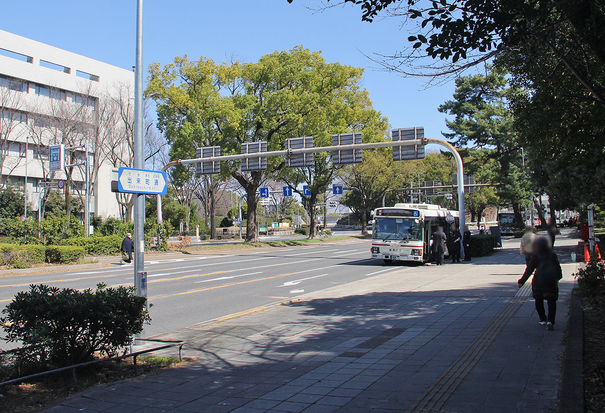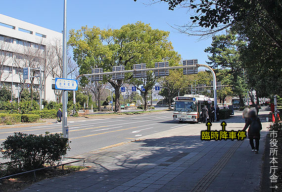 出来町通を西進してきた市役所行きは,清水橋を直進して市役所1つ手前の市役所東交差点を左折し,市役所裏の2車線道路の南向きに設置された臨時降車停に到着します.従来はこの場所に市バス臨時乗車停が設けられていました.