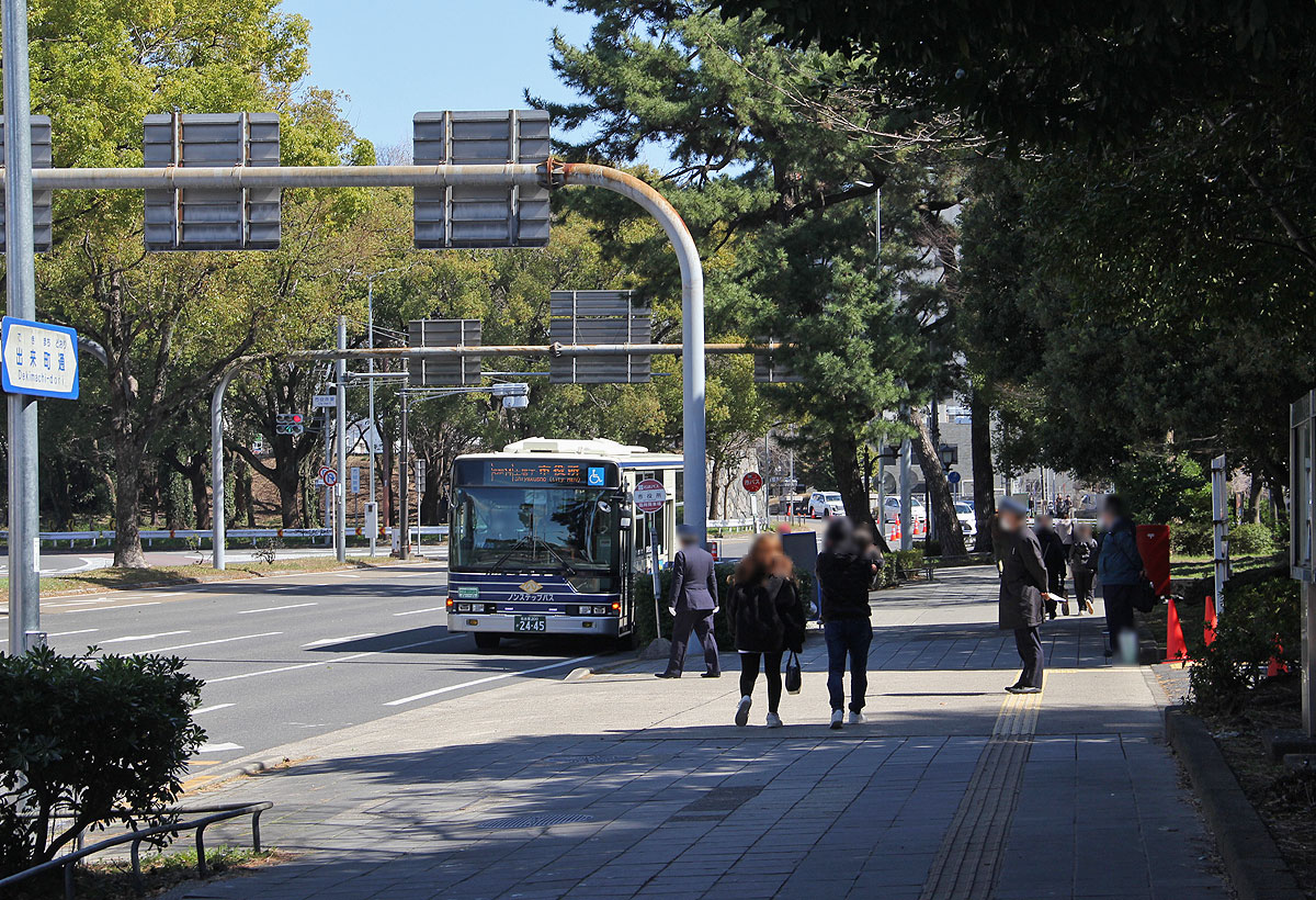 これに合わせ,迂回運行経路が市役所本庁舎・県庁本庁舎を大きく回り込むような経路に見直されました. 時間調整は臨時降車停付近の路上待機となりました.