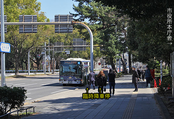 時間になると,臨時降車停の反対側,市役所裏(東庁舎前)に新たに設置された北向きの臨時乗車停で乗車扱いののち,市役所東交差点を右折して本線に復帰します.