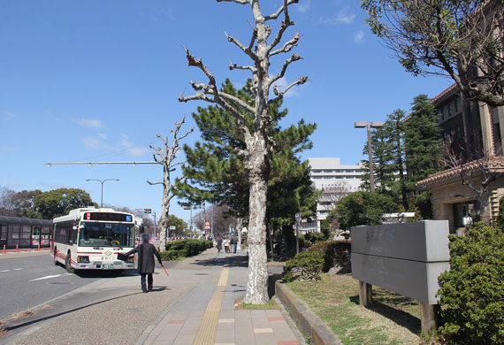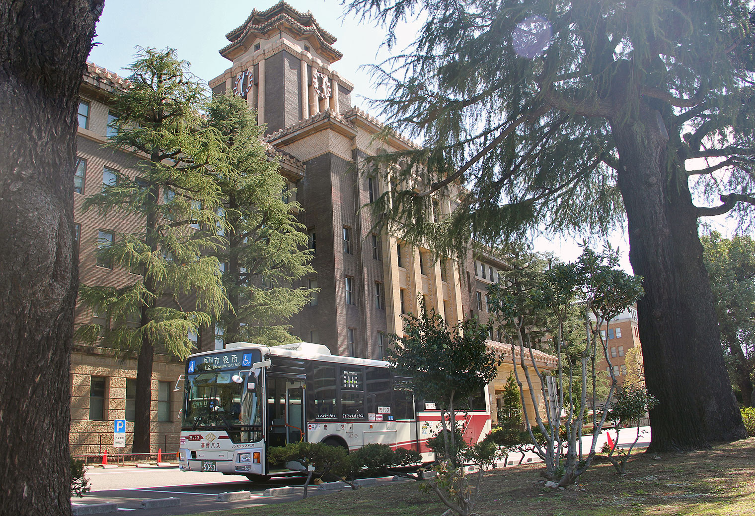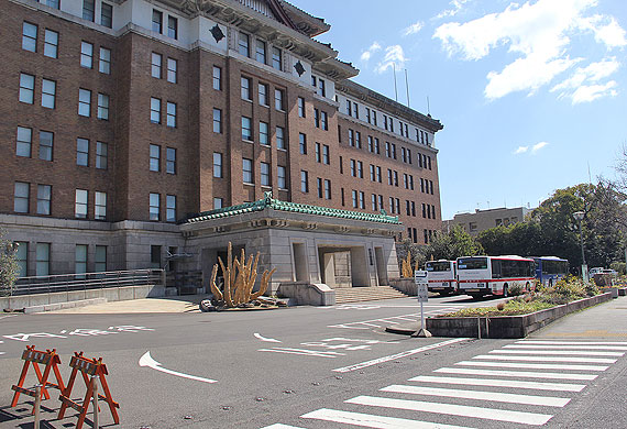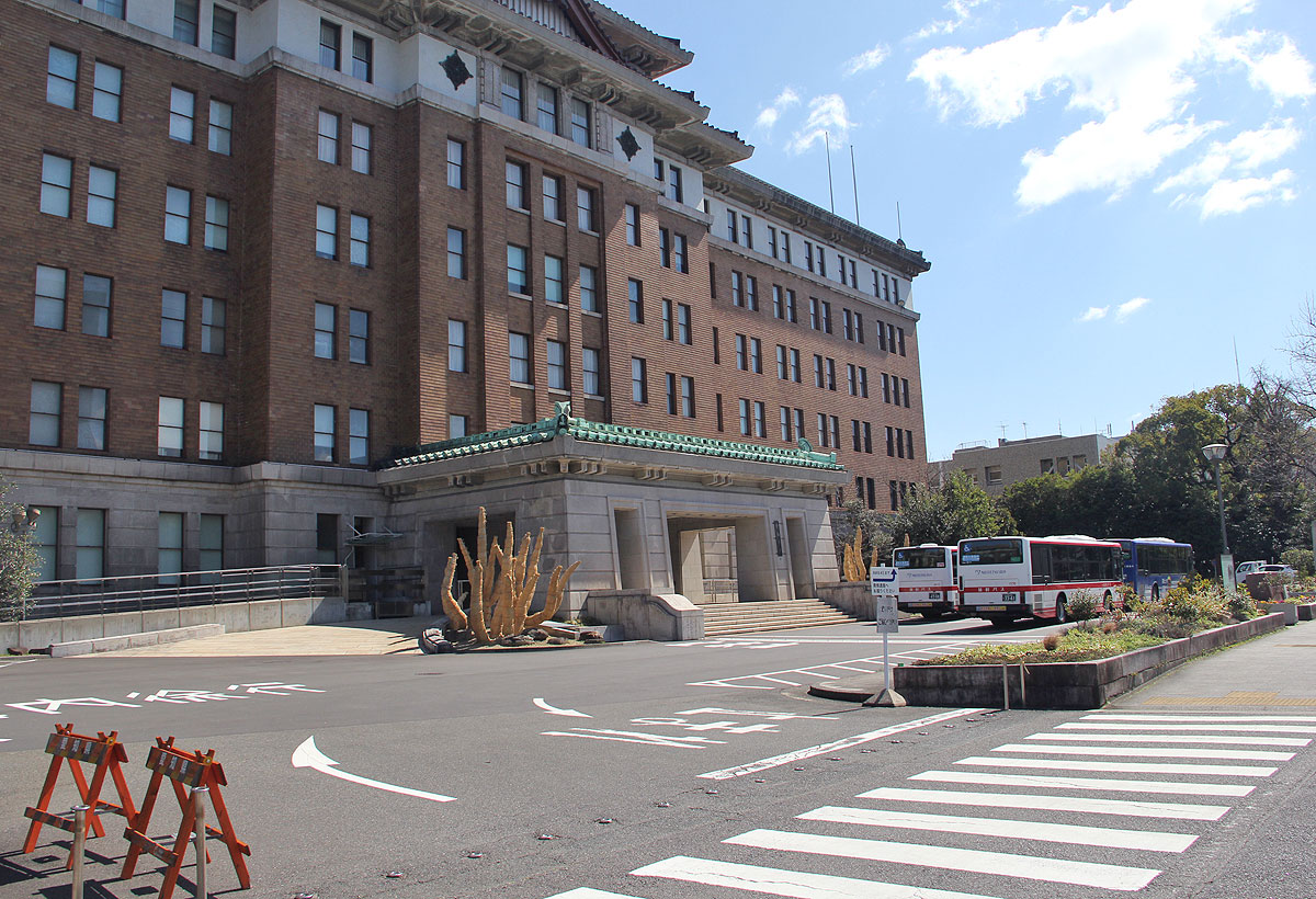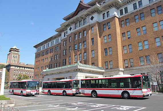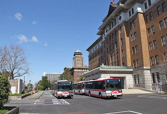 ▲市役所本庁舎の西側正面(大津通側)より市役所駐車場に進入する市バス基幹バス |