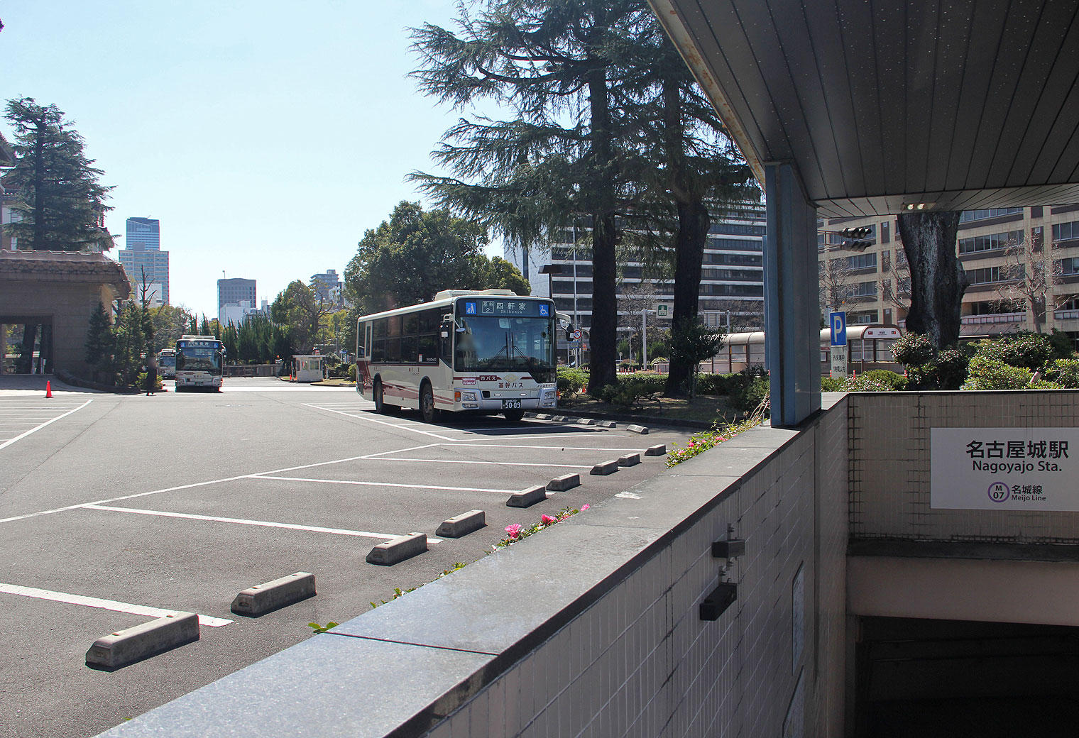 ▲(9時〜15時)市バス5番のりば 臨時乗車停留所と停車中の名鉄基幹バス |
