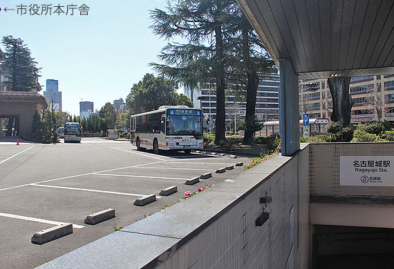 発車時間になると市役所東交差点を左折して,市役所裏の2車線道路上に設置された臨時乗車停で乗車扱いの後,そのまま南下して名古屋城の外堀をぐるりと周り本線復帰していました.