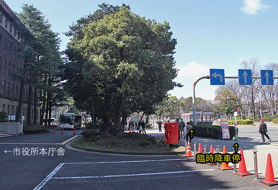 ▲市役所手前に設けられた臨時降車停 |