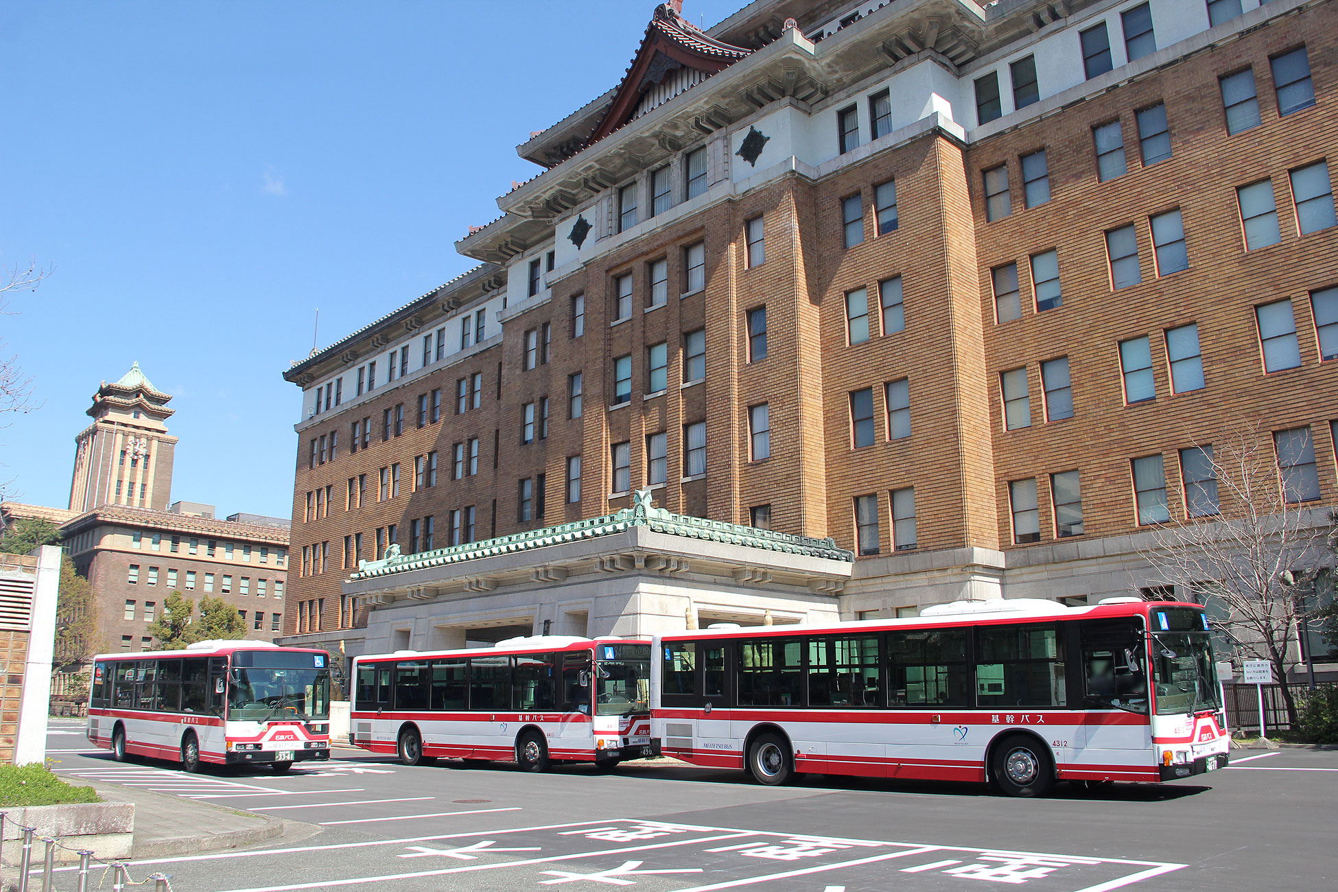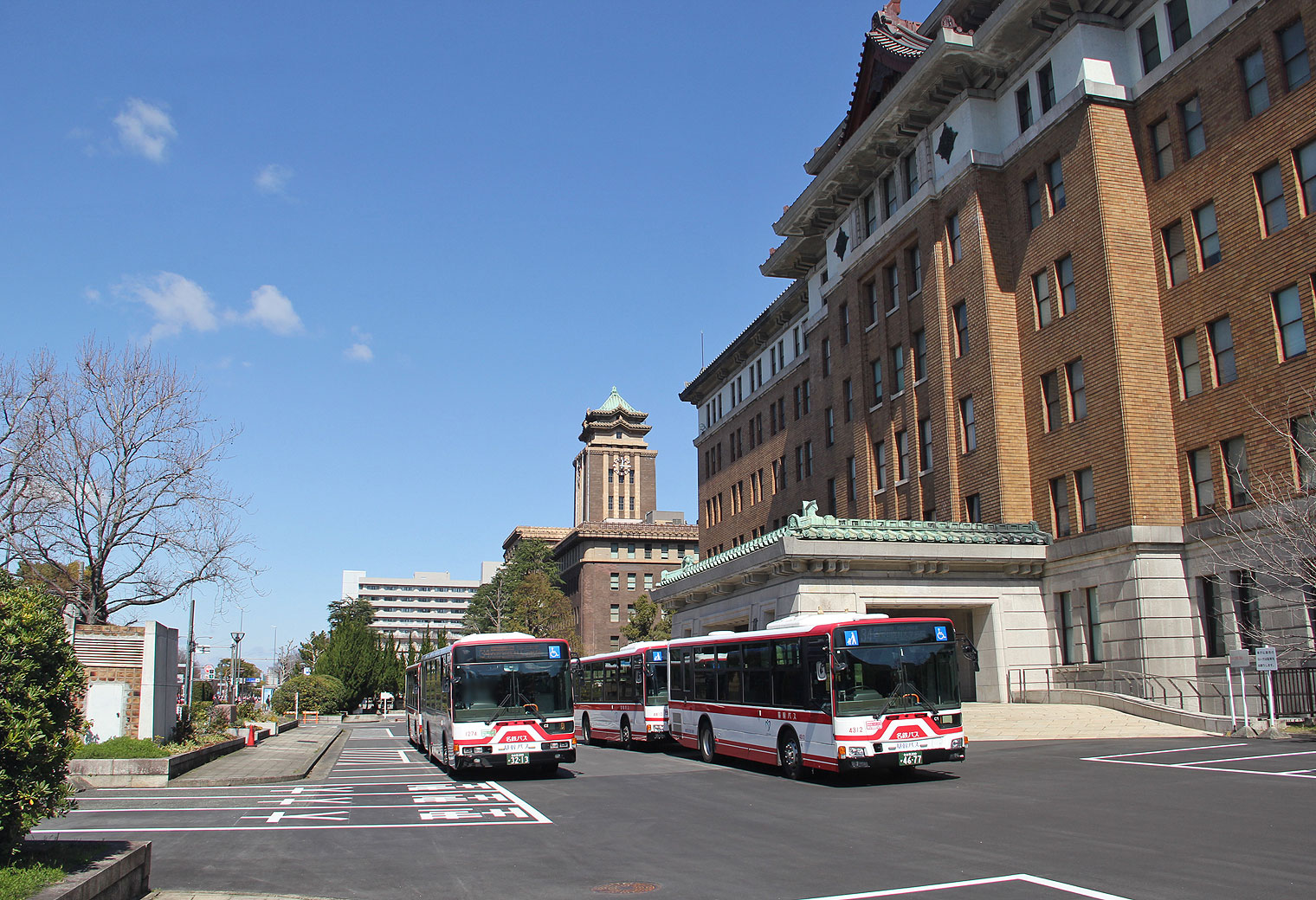▲手前が県庁(名鉄バス待機)・奥が市役所(市バス待機) |