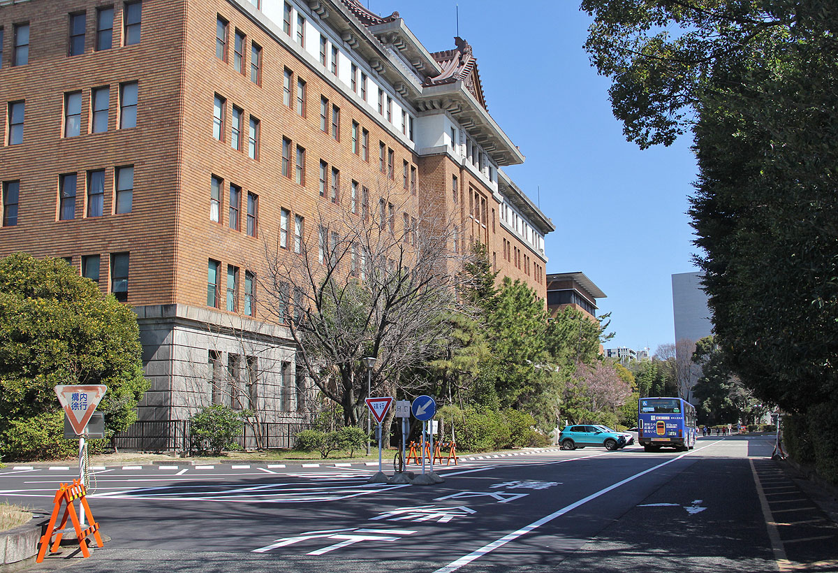 名鉄バスは県庁本庁舎の駐車場で待機します. 西側正面より進入し,庁舎南側を経由して東側より出庫し,大回りで乗車停に向かいます.