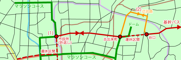当ページでは基幹2号系統を中心に取り上げます. (1)市役所折返しと,(2)ドーム周辺での迂回運行が行われています.