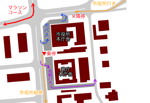 市役所交差点のうち,北側と西側はマラソンコースとなりますが,基幹バス経路の南側と東側は走行可能なため,市役所本庁舎・県庁本庁舎を大きく回り込むような経路で折返し運行を行なっています.