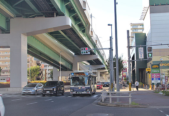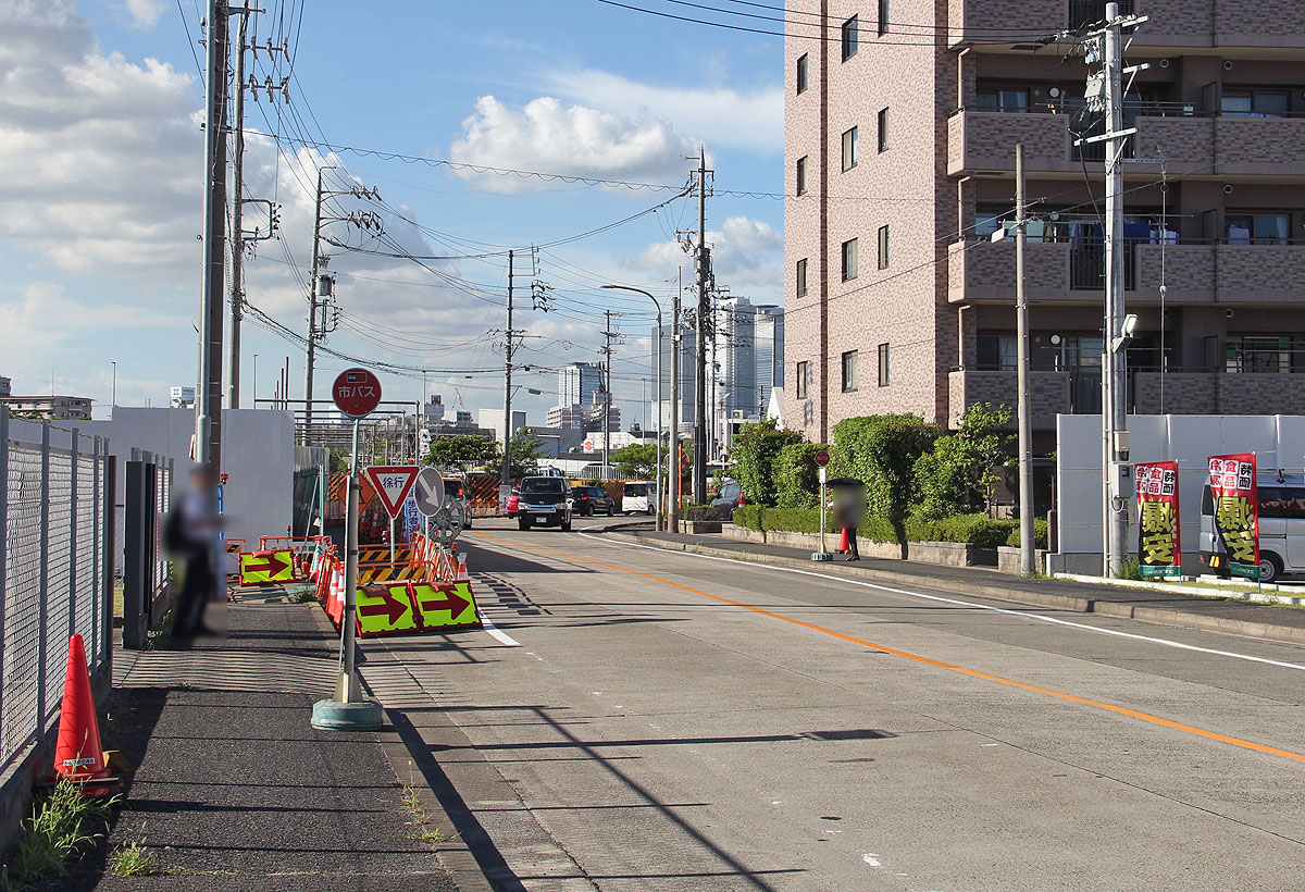 ▲運河沿い迂回路を進む名駅20号系統 廃止されたバス停横を通過する |