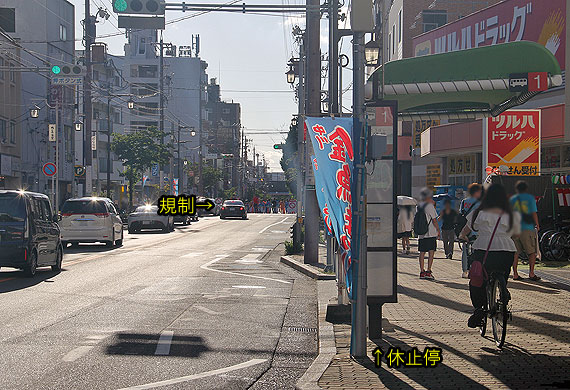 規制区間内の二女子停留所は,運河沿いに臨時移設されました.