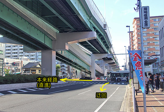 ▲尾頭橋交差点を左折し迂回路に進む(西行) |