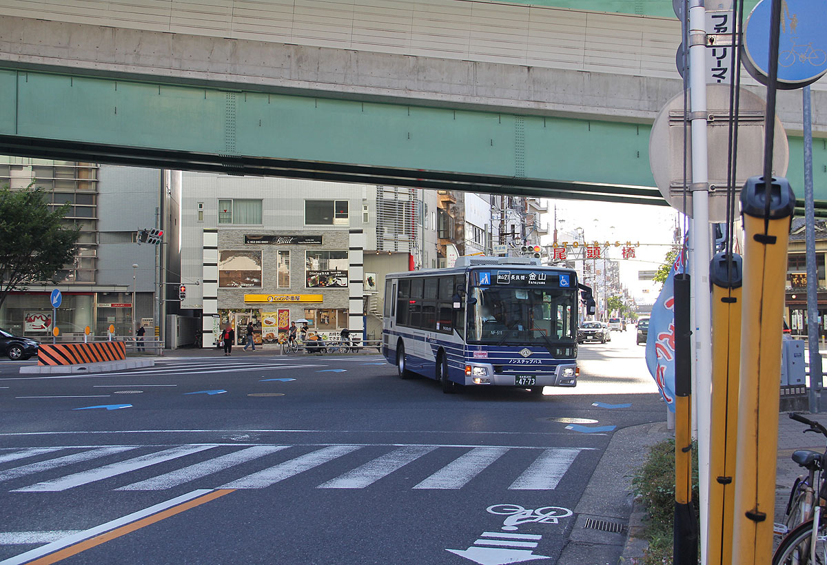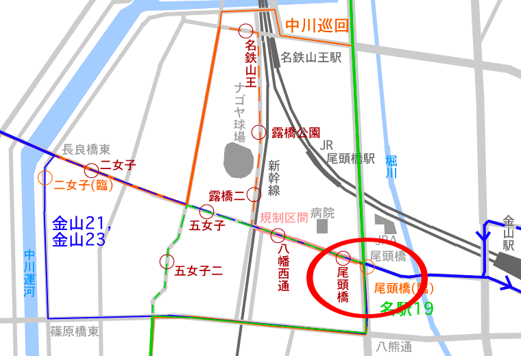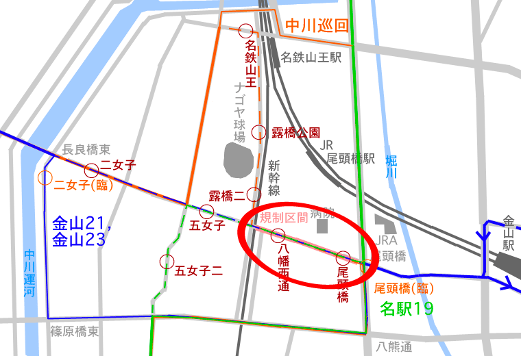 交通規制区間の東端の尾頭橋交差点では,直進できない金山21号,金山23号系統が,江川線を経由して南の八熊通に大きく迂回します.