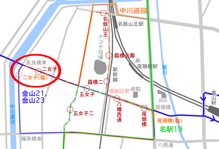 名駅19,名駅20,金山21,金山23号,中川巡回系統 |