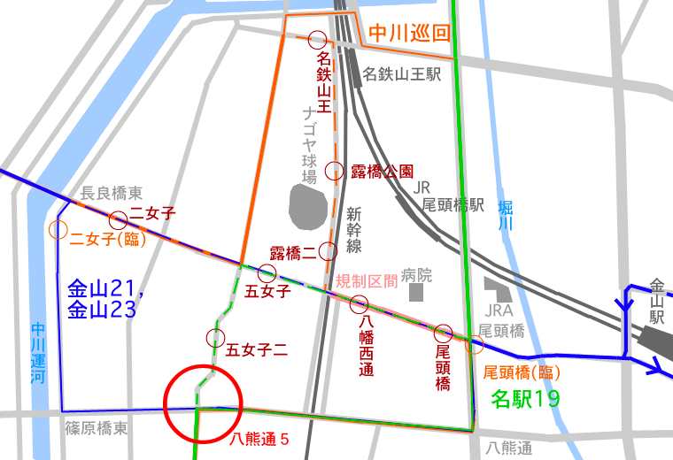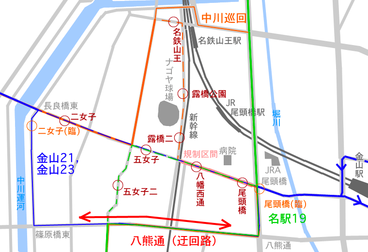 迂回系統:名駅19,金山21,金山23号系統,中川巡回系統